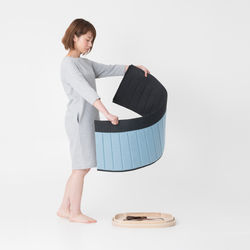 底板と天板にフェルトを差し込むだけで簡単にテーブルになる。また分解も容易でフラットパッケージが可能である。